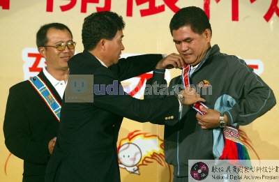 內容說明:原住民棒球協會理事長吳俊達(中)在前任理事長劉義傳(左)監交下,交接給新任理事長藍文成(右)。